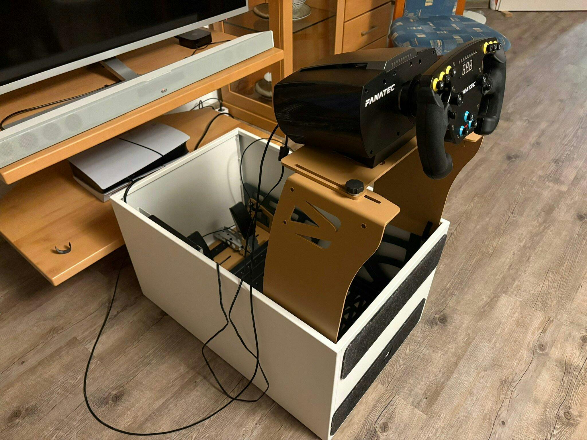 The patented box shape design is more then just for comouflage, it actually provides the stength, stabilty and stifness to be able to handle pro grade wheels such as the Logitech 'Pro' wheel. Now imagine combining this with Gran tourismo 7 and a Playstation VR2 (or beamer or widescreen). This way the CoffeeRacer 'Living' really brings console racing to whole new levels.